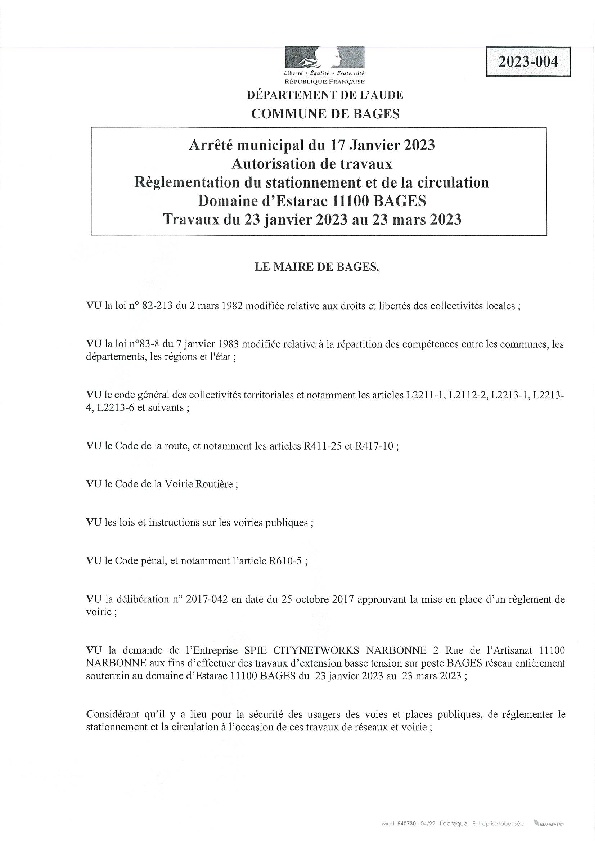 -Arrêté municipal du 17 janvier 2023 - Circulation (mis en ligne le 18/01/2023)