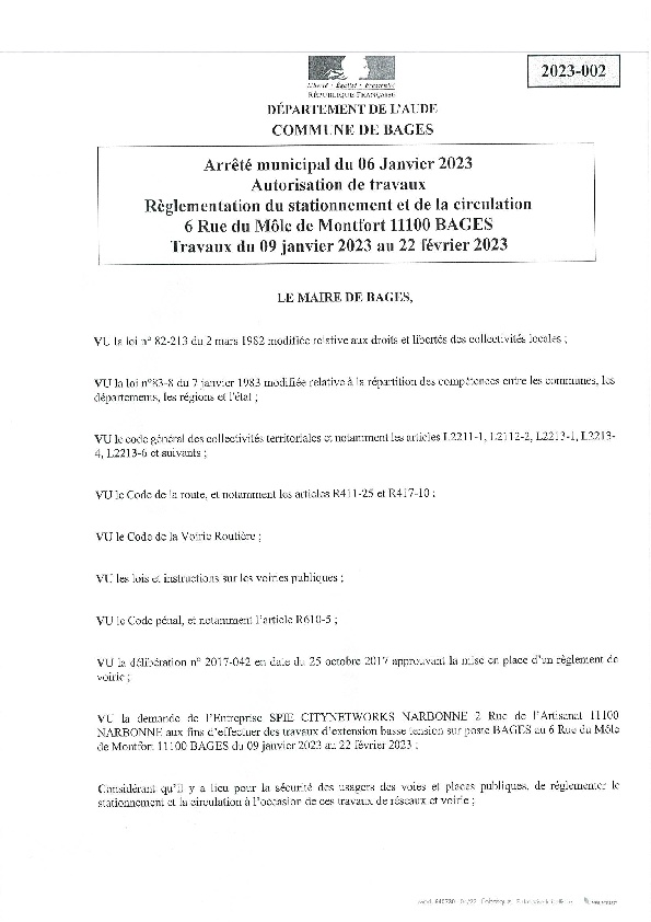 -Arrêté municipal du 6 janvier 2023 - Autorisation de travaux (mis en ligne le (06/01/2023)