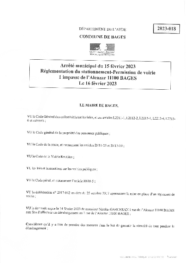-Arrêté municipal du 23 février 2023 - Règlementation stationnement (mis en ligne le 23/02/2023)